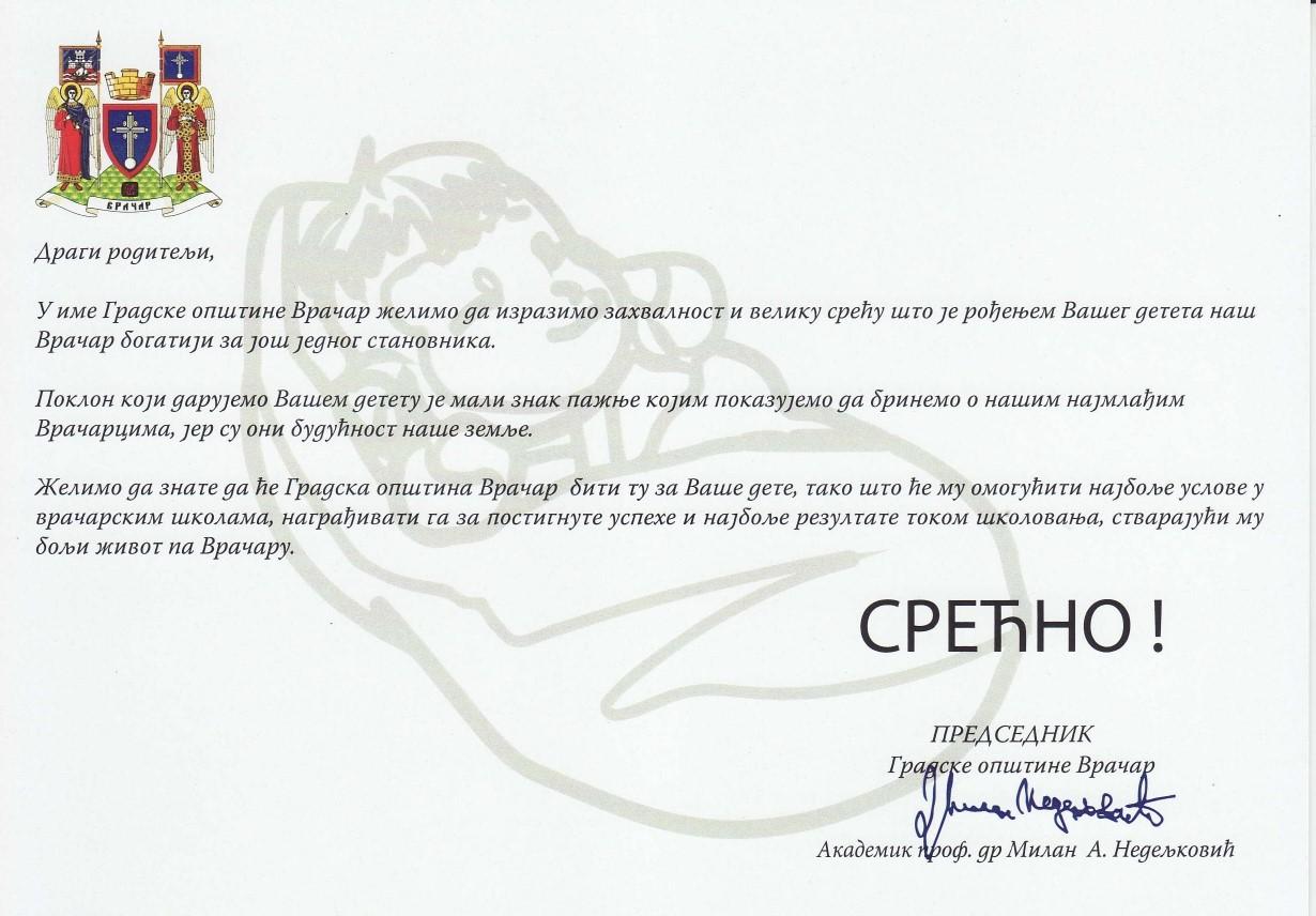 На тај начин желимо да изразимо захвалност што је рођењем вашег детета наш Врачар богатији за још једног становника.