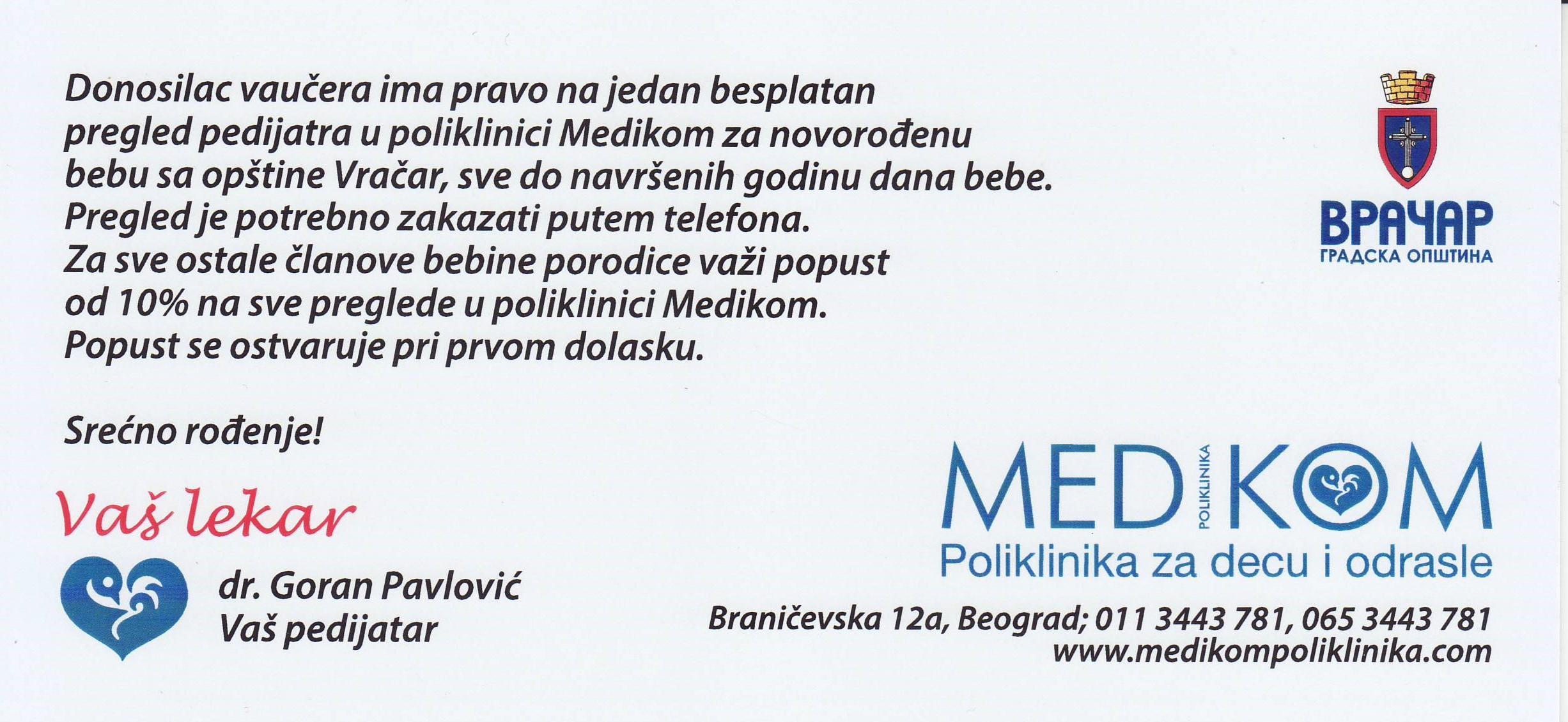 Уз неколико корисних и квалитетних производа за бебе (пешкир са капуљачом, ћебенце, глодалица/звечка, посуда за чување хране и млека, флашица и шоља, портикла), и ове године је, захваљујући Поликлиници „МЕДИКОМ“ у Браничевској 12а на Врачару, обезбеђен ваучер за бесплатни педијатријски преглед.