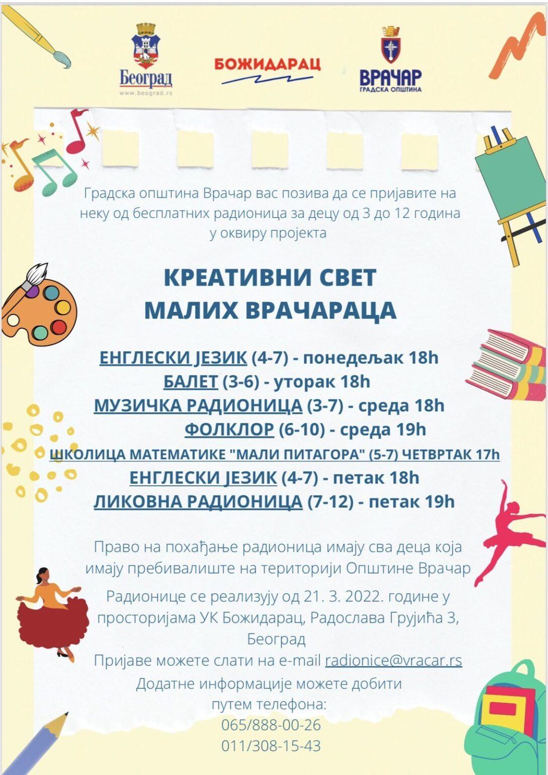 Пројекат „Креативни свет малих Врачараца“ намењен је најмлађим становницама наше општине узраста од 3 до 12 година, како би уз игру и забаву кроз низ едукативно-креативних радионица провели квалитетно време са својим вршњацима и усвојили нова знања и вештине.