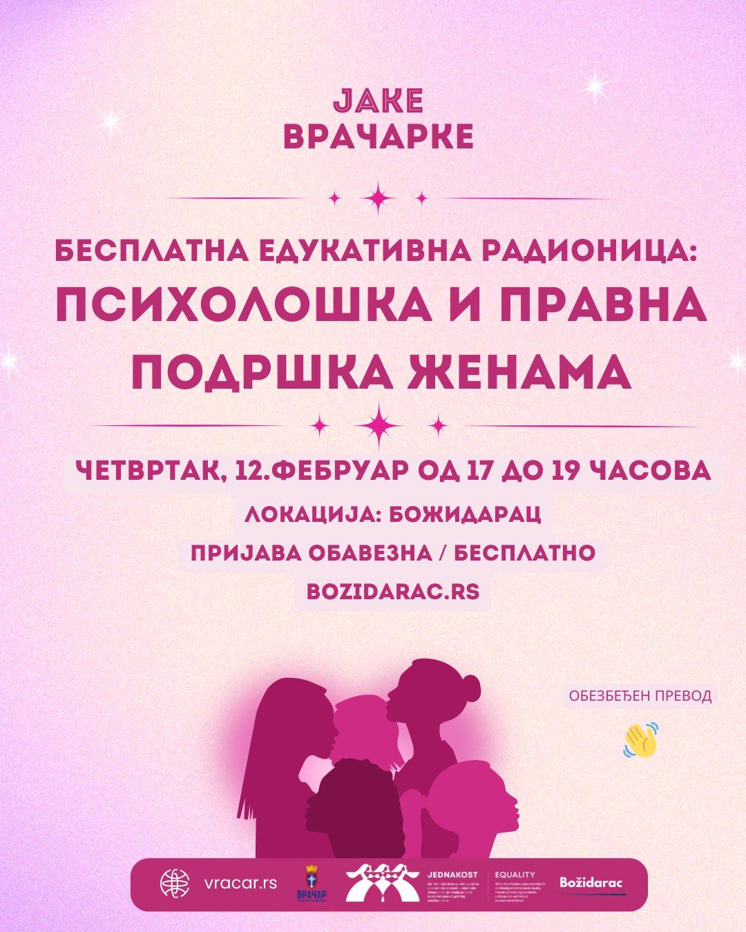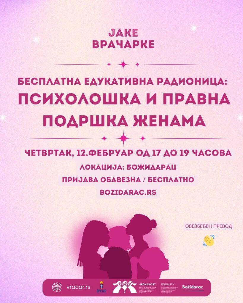 Градска општина Врачар, у оквиру пројекта „За јаке Врачарке“, а у сарадњи са УК “ Божидарац“ позива вас на бесплатну едукативну радионицу посвећену личном оснаживању, подршци и информисању жена у области заштите од насиља у породици.