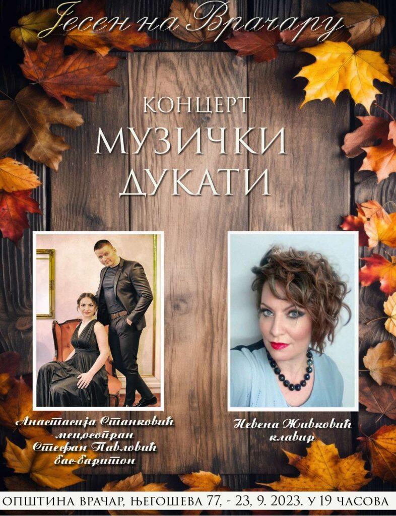 U okviru ciklusa „Jesen na Vračaru“ u galeriji Gradske opštine Vračar, u subotu, 23. septembra 2023. godine, sa početkom od 19 časova održaće se koncert „Muzički dukati“ za sve ljubitelje muzike i umetnosti.