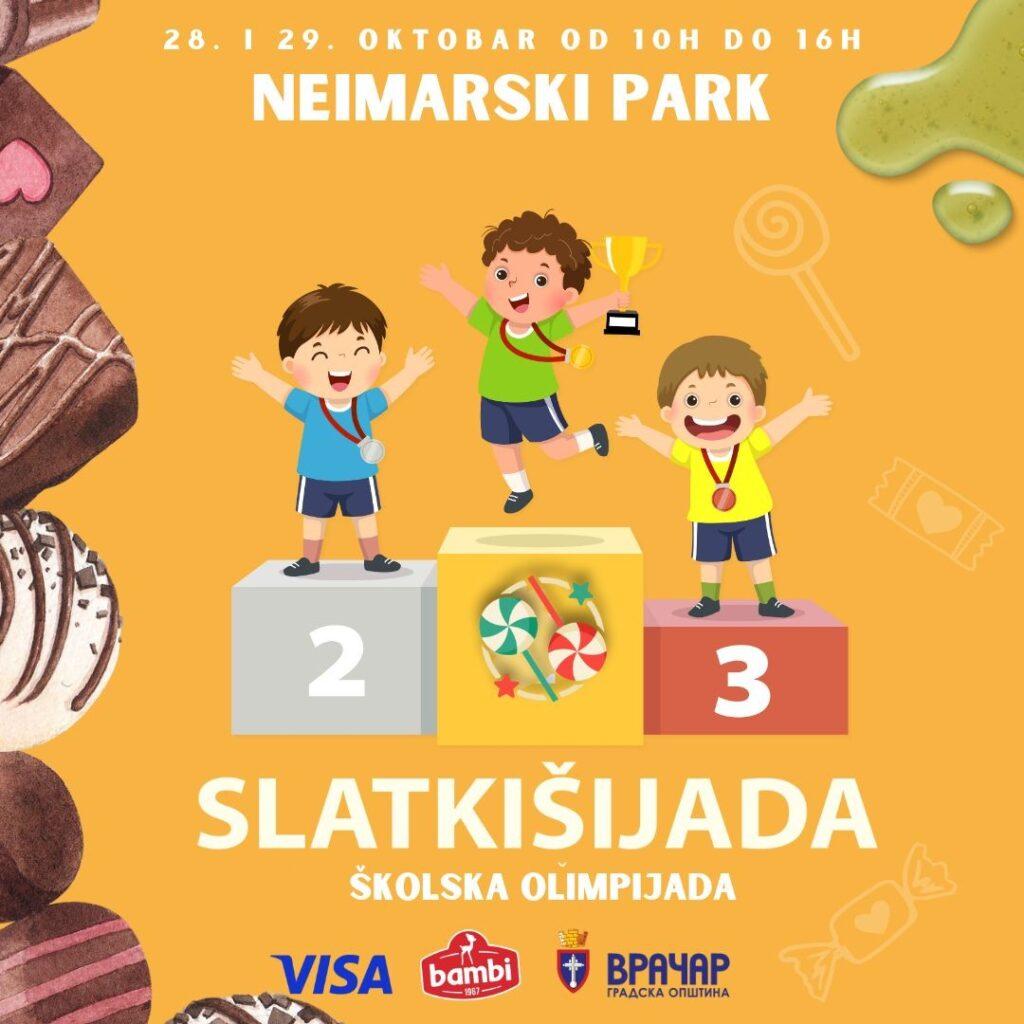 Припремите се за викенд пун дружења, навијања, забаве, смеха и слатких изненађења. Неимарски парк у суботу и недељу, 28. и 29. октобра, од 10 до 16 часова, постаће подијум за најслађе спортско такмичење у граду „Слаткишијаду“. На свечаном отварању манифестације, у суботу, 28. октобра, у 12 часова присутнима ће се обратити заменица председника Градске општине Врачар Радмила Сарић.