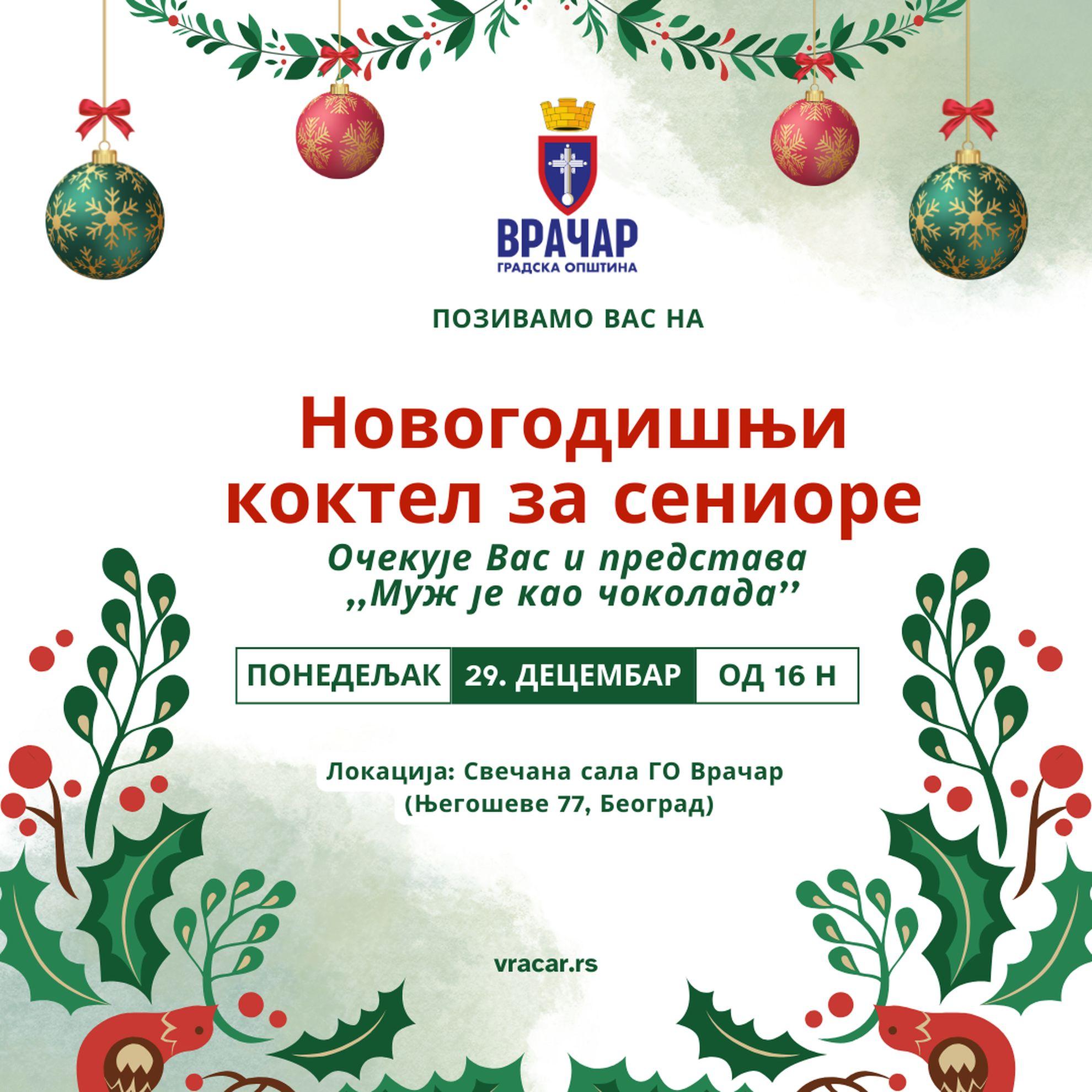 Gradska opština Vračar sa velikim zadovoljstvom poziva naše drage sugrađane, seniore, da zajedno ispratimo staru i nazdravimo novim počecima na svečanom novogodišnjem koktelu. Ovim povodom pripremili smo bogat program, druženje i specijalno iznenađenje, hit pozorišnu predstavu „Muž je kao čokolada“.
