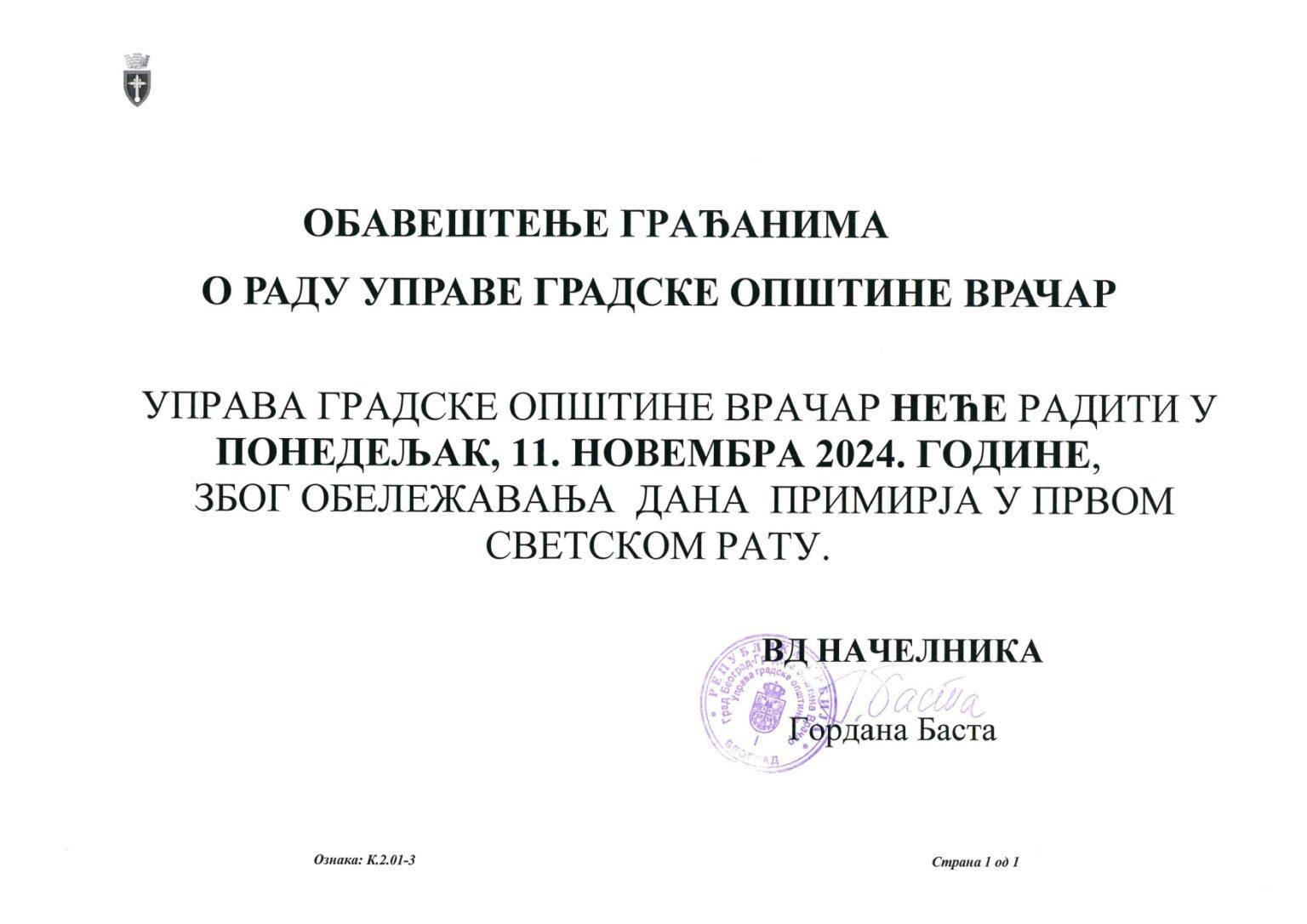 ОБАВЕШТЕЊЕ ГРАЂАНИМА О РАДУ УПРАВЕ ТОКОМ ОБЕЛЕЖАВАЊА ДАНА ПРИМИРЈА У ПРВОМ СВЕТСКОМ РАТУ