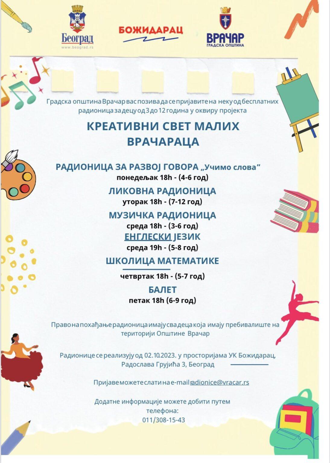 Бесплатне едукативно-креативне радионице намењене су деци Врачара узраста од 3 до 12 година, а реализоваће се почев од 2. октобра 2023. до краја године у Установи културе „Божидарац“ у Улици Радослава Грујића 3, Београд-Врачар, радним данима у послеподневним часовима. За учествовање на радионици родитељи могу пријавити своје малишане попуњавањем online упитника на следећем линку: