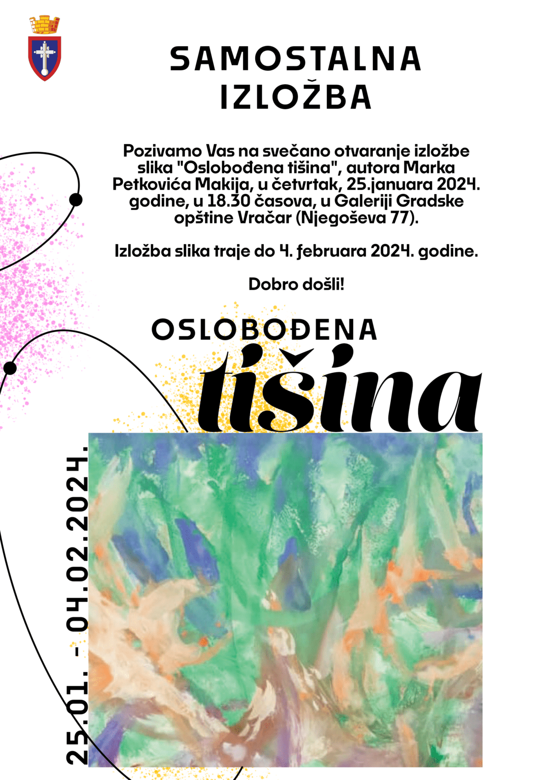 Самостална изложба „Ослобођена тишина“ биће представљена у галерији Градске општине Врачар од 25. јануара до 4. фебруара 2024. године. На свечаном отварању изложбе у четвртак, 25. јануара 2024. године, од 18.30 часова представиће се аутор Марко Петковић, а у име Градске општине Врачар присутне ће поздравити заменица председника Радмила Сарић и члан Већа Драги Лукић.